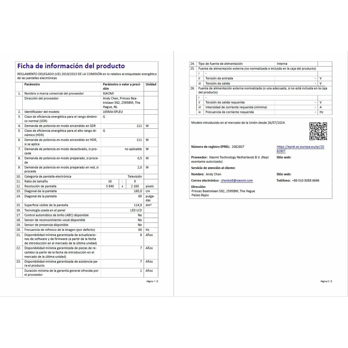 The Xiaomi S Mini Led 2025 is an advanced Smart TV with a 65-inch screen that delivers high-quality visuals thanks to its LED QD-Mini panel with 4K Ultra HD (3840 x 2160 pixels) resolution and an impressive 144 Hz refresh rate, ideal for dynamic content and smooth gaming. Its wide 178° viewing angle ensures sharp images from almost any position, while the 94% DCI-P3 color gamut coverage provides vivid and realistic colors. This model also supports advanced imaging technologies such as Dolby Vision IQ, Dolby Vision, HDR10+, HLG, and Filmmaker Mode, which enhance picture quality by automatically adapting to the environment and content displayed. For connectivity, it features Bluetooth 5.2 and dual-band Wi-Fi 6 for fast and stable connections, along with multiple ports including three HDMI 2.1 with CEC, ALLM, and VRR support, two USB ports (one 2.0 and one 3.0), Ethernet, optical digital audio output, and a 3.5 mm headphone jack, covering all external device and accessory needs. This TV integrates a powerful Quad Cortex A73 processor paired with a Mali-G52 MC1 GPU, supported by 3 GB RAM and 32 GB internal storage, offering solid performance and enough capacity for apps and games. It runs on Google TV, providing easy, organized access to streaming platforms, apps, and content, with smart features like the built-in Google Assistant, Chromecast built-in, Miracast, and support for Apple AirPlay, ensuring compatibility with a wide range of digital devices. In terms of sound, it includes a stereo system with two 12.5 W speakers supporting Dolby Atmos, delivering clear and immersive audio. This black TV has an energy rating of G, an elegant design, dimensions of 1445.7 x 390 x 904 mm, an approximate weight of 19 kg, and is VESA mount compatible with 300 x 300 mm. It comes with all necessary installation accessories, including a Bluetooth remote control and basic tools. The Xiaomi S Mini Led 2025 is a complete, modern choice for those seeking a device that combines image quality, advanced connectivity, and smart features in a large-screen format.