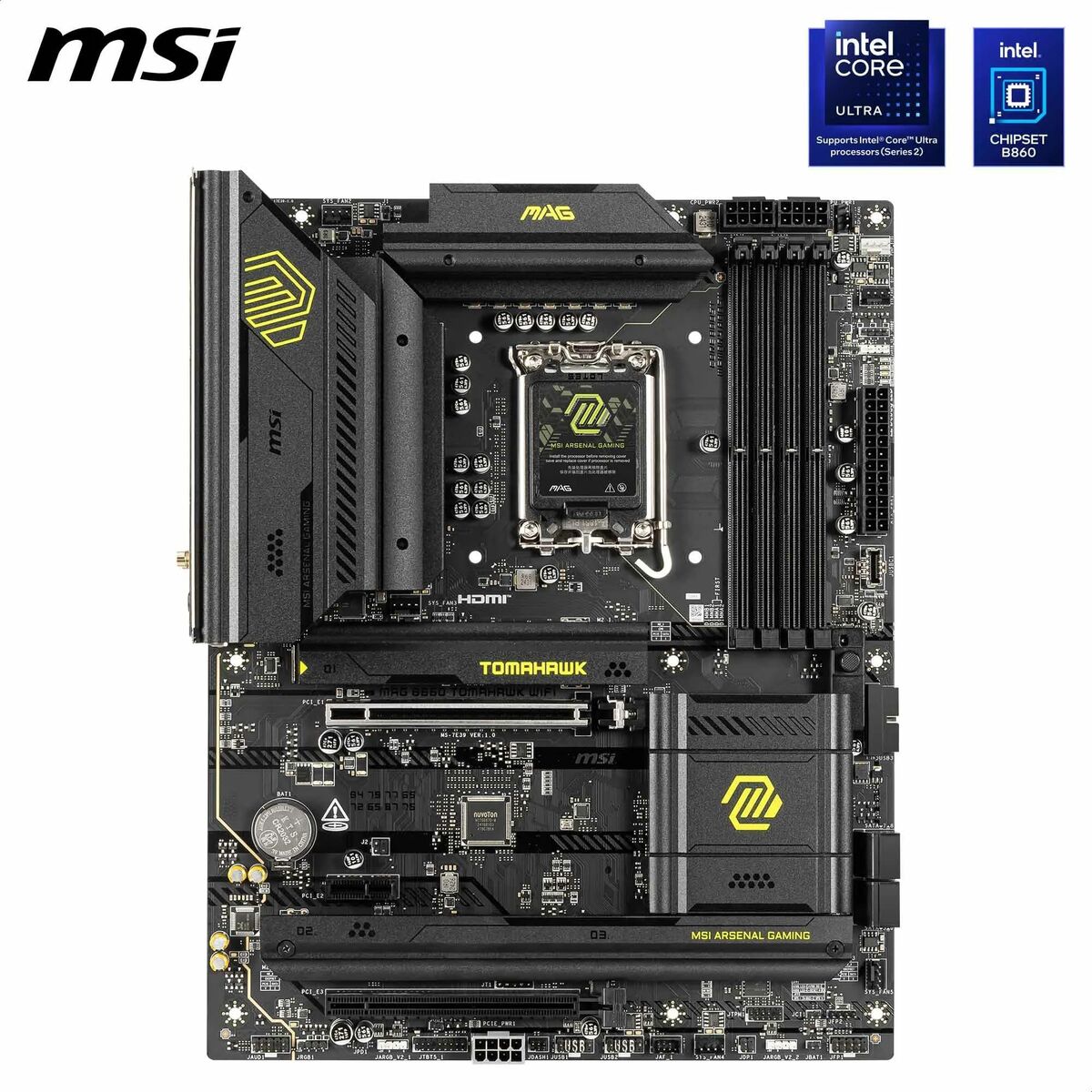 The MSI motherboard presented is a versatile solution compatible with PCs featuring the LGA 1851 socket, designed to support next-generation processors based on the Intel platform, specifically those using the Intel B860 chipset. This chipset offers an optimal balance between performance and features, suitable for setups aimed at both advanced users and professional environments, ensuring support for modern technologies and efficient connectivity. Its ATX form factor guarantees broad compatibility with standard cases and facilitates the integration of additional components, promoting good thermal management and expansion space. Among its connectivity options, it includes an HDMI output, allowing direct and simple connection to monitors or TVs to transmit high-resolution video and audio signals, expanding its use for visual design, multimedia, or general work applications. Although it supports both AMD and Intel architectures in terms of chipset, this motherboard is specifically oriented toward Intel processors requiring the LGA 1851 socket, ensuring stability and leveraging advanced features of the compatible ecosystem. Overall, this MSI motherboard combines reliable and up-to-date specifications for PC builds focused on balanced performance, broad compatibility, and modern connectivity in an ATX format. It is a suitable choice for those seeking a solid and flexible base to build a system with recent Intel processors.