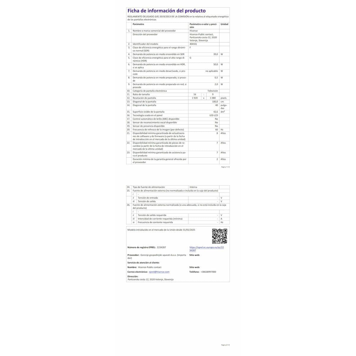 The Hisense 40" Smart TV is a high-definition television that combines remarkable picture quality with a complete multimedia experience, ideal for home environments and spaces seeking good audiovisual performance. Its 40-inch QLED screen offers a Full HD 1920 x 1080 resolution, ensuring vivid colors and clear sharpness, enhanced by QLED panel technology, known for its ability to reproduce a wide color spectrum and improve brightness. This model features a sober design in black with a flat shape, facilitating integration into any living room or bedroom. Its VIDAA operating system allows access to smart TV functions, including wireless connection via Wi-Fi to access streaming services and apps. It includes both analog and digital tuners, compatible with DVB-C, DVB-S, DVB-S2, DVB-T, and DVB-T2 formats, ensuring compatibility with various terrestrial and satellite TV signals. With an estimated RMS power of 16W, this TV delivers adequate sound for its size, complemented by noise reduction and equalizer technologies to optimize audio experience. It has USB 2.0 ports for playing content from external devices. The 16:9 aspect ratio is standard for viewing HD content without distortion. The energy rating is F, relevant for users concerned about power consumption. Overall, the Hisense 40" 40A5Q is a practical and versatile option within the mid-size Smart TV category, offering essential features for quality audiovisual playback with integrated smart functions.