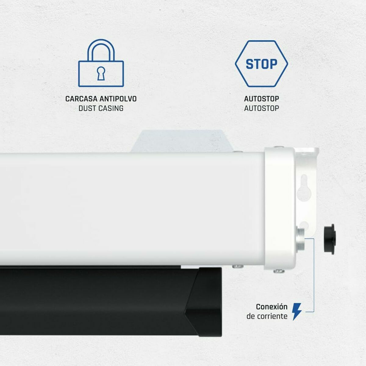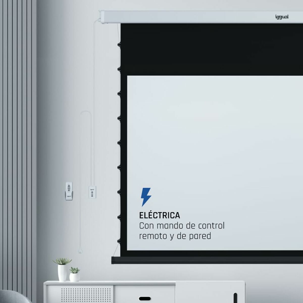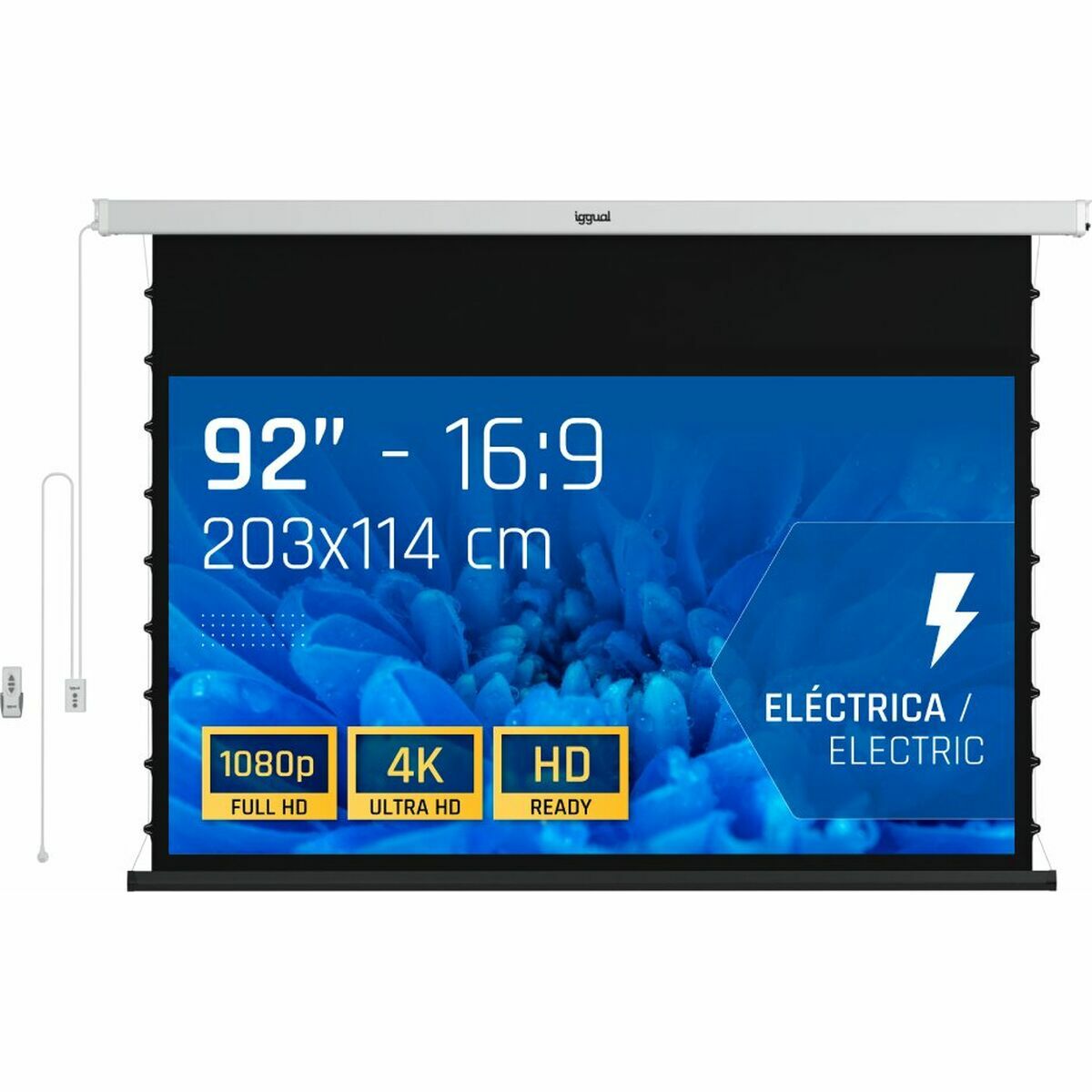 The iggual Wall-Mounted Electric Screen is a versatile and practical solution for audiovisual setups in professional or home environments. This projection screen features a 16:9 format, ideal for viewing high-definition content, with overall dimensions of 203 x 114 cm providing a useful diagonal surface of 92 inches, perfect for presentations, home cinema, or any type of multimedia projection. Its matte white frame ensures visual integration with any décor, offering a clean and minimalist finish. Made with high-quality fabric suitable for capturing images with good contrast and faithful color reproduction, this screen connects directly to the power supply at 230 V, guaranteeing automated and silent deployment and retraction for greater convenience and durability. Additionally, it includes a remote control that allows operation without physical handling, enhancing usability and adapting to different space configurations. It also offers USB connectivity, a feature that can facilitate future upgrades or integration with external systems. Overall, this screen represents a balanced and functional option for users needing quality widescreen projection, easy handling, and a discreet design that fits various settings. Its combination of size, format, and automation positions it as an effective tool for professional audiovisual presentations or enjoying multimedia content in private spaces.