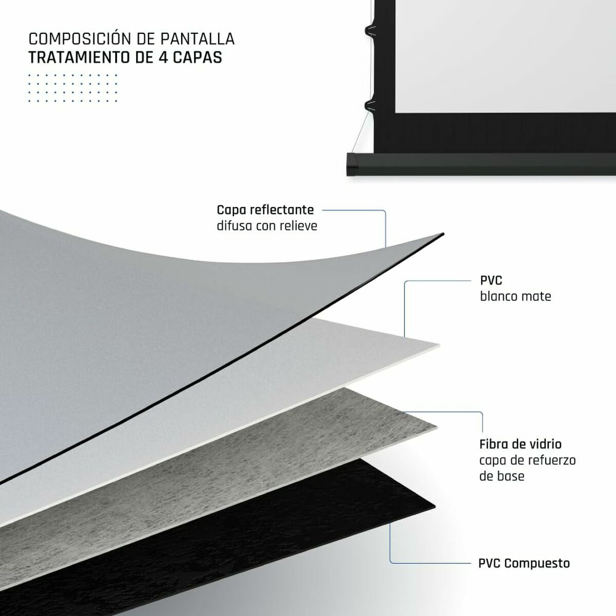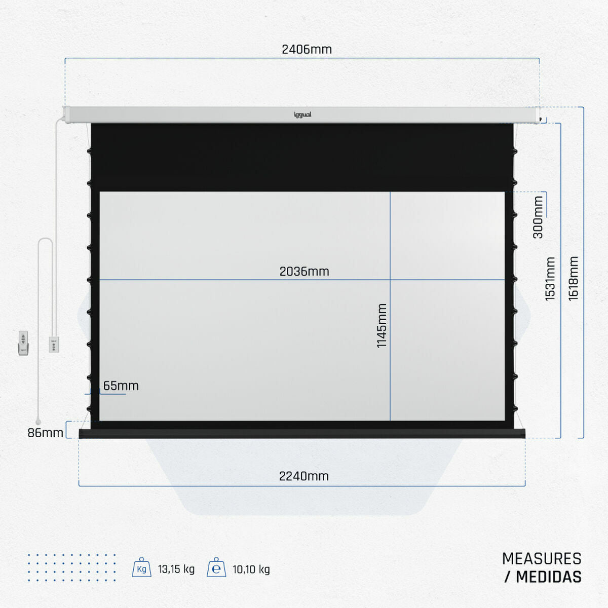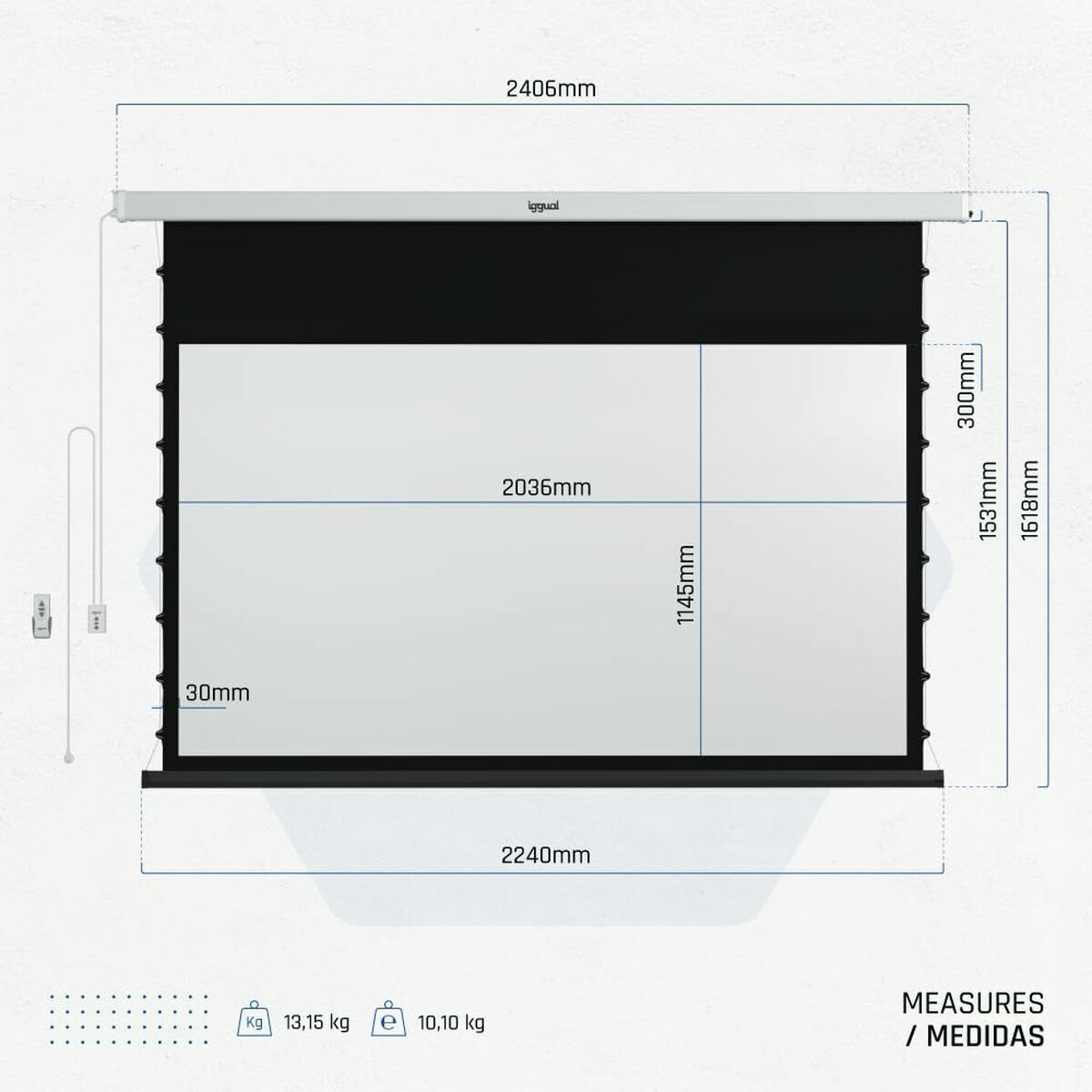 The iggual Wall-Mounted Electric Screen is a versatile and practical solution for audiovisual setups in professional or home environments. This projection screen features a 16:9 format, ideal for viewing high-definition content, with overall dimensions of 203 x 114 cm providing a useful diagonal surface of 92 inches, perfect for presentations, home cinema, or any type of multimedia projection. Its matte white frame ensures visual integration with any décor, offering a clean and minimalist finish. Made with high-quality fabric suitable for capturing images with good contrast and faithful color reproduction, this screen connects directly to the power supply at 230 V, guaranteeing automated and silent deployment and retraction for greater convenience and durability. Additionally, it includes a remote control that allows operation without physical handling, enhancing usability and adapting to different space configurations. It also offers USB connectivity, a feature that can facilitate future upgrades or integration with external systems. Overall, this screen represents a balanced and functional option for users needing quality widescreen projection, easy handling, and a discreet design that fits various settings. Its combination of size, format, and automation positions it as an effective tool for professional audiovisual presentations or enjoying multimedia content in private spaces.