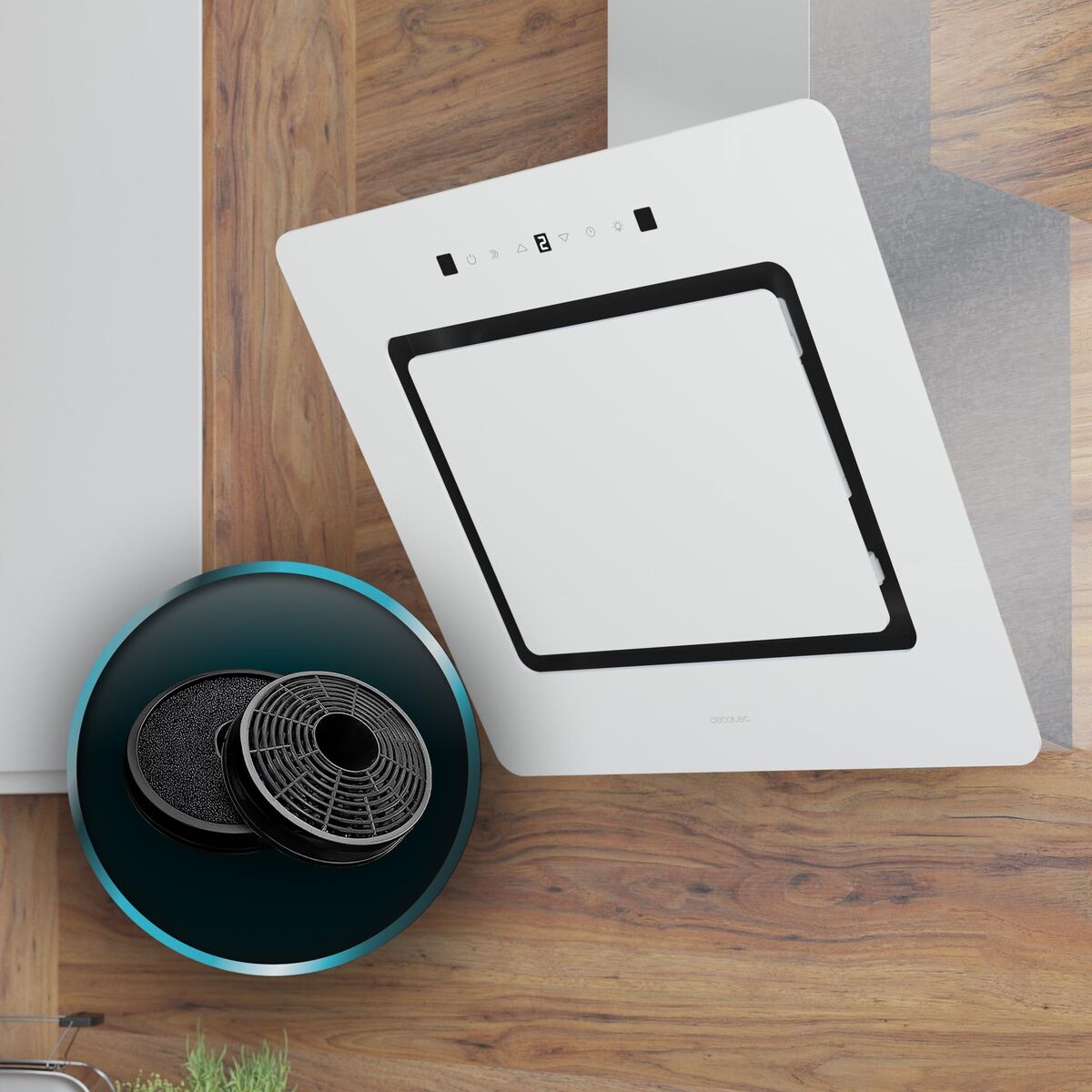 The Bolero Flux DT 608002 conventional hood by Cecotec is a kitchen extractor designed to deliver efficient performance and a modern look. It features a 60 cm width, ideal for standard domestic kitchen surfaces, and an elegant finish with a white glass front and a stainless steel chimney that provide a sleek and durable design. Its powerful 210 W motor offers a notable suction capacity of up to 800 m³/h, ensuring rapid removal of smoke and steam, while its 3 power levels allow adjustment according to cooking needs, complemented by the Booster function for immediate intensified suction. The A++ energy rating guarantees efficient and environmentally friendly daily use. For filtration, it includes a dual system with Ø176 mm carbon filters that neutralize odors, and a five-layer aluminum grease filter that protects the hood and maintains its efficiency. Integrated LED lighting, along with Bluelit lights, improves visibility and adds an aesthetic touch during operation. Among its most innovative features are the touch control for intuitive option management, Hand Movement Control to operate the hood with hand gestures, and the Delay Function that automates shutdown for hassle-free use. The combination of materials, power, and technology makes this hood a complete solution to keep the kitchen environment clean and smoke-free efficiently and stylishly. In summary, the Bolero Flux DT 608002 offers an optimal balance of functionality, design, and energy efficiency for demanding users seeking a reliable and modern extractor hood.