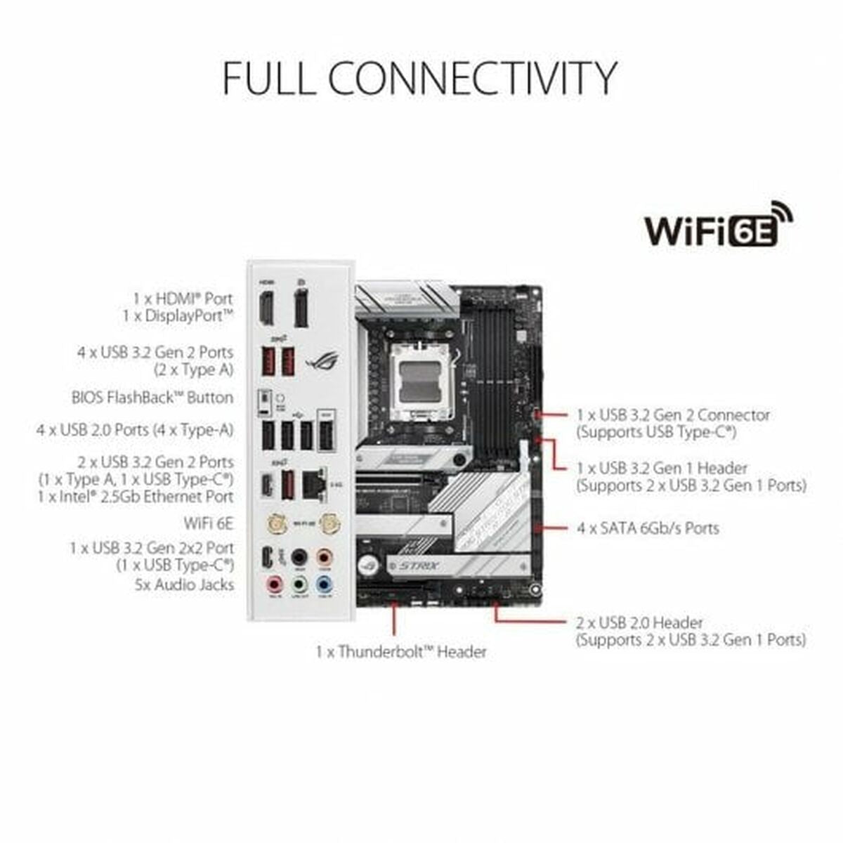The ROG STRIX B650-A GAMING WIFI from Asus is a motherboard specially designed for performance enthusiasts and users who need a solid, scalable platform based on the latest AMD architecture. This motherboard features the AMD B650 chipset, compatible with the AMD AM5 socket, allowing full use of AMD’s latest generation processors to deliver optimal performance in both gaming and professional tasks. It has an ATX form factor, providing an ideal balance between component space and compatibility with most standard cases. It supports DDR5 SDRAM, enabling higher transfer speeds and greater energy efficiency, essential for modern setups. For connectivity, it includes advanced options such as HDMI, USB-C, and USB 2.0 ports, plus native Wi-Fi 6 integration, ensuring fast and stable wireless connections crucial for online gaming and data transfer. Its black design offers a sober, elegant finish, designed to blend with any gaming setup or workstation. In summary, the Asus ROG STRIX B650-A GAMING WIFI is a robust and versatile technical solution that meets the current demands of users requiring compatibility, speed, and a platform ready for future upgrades.