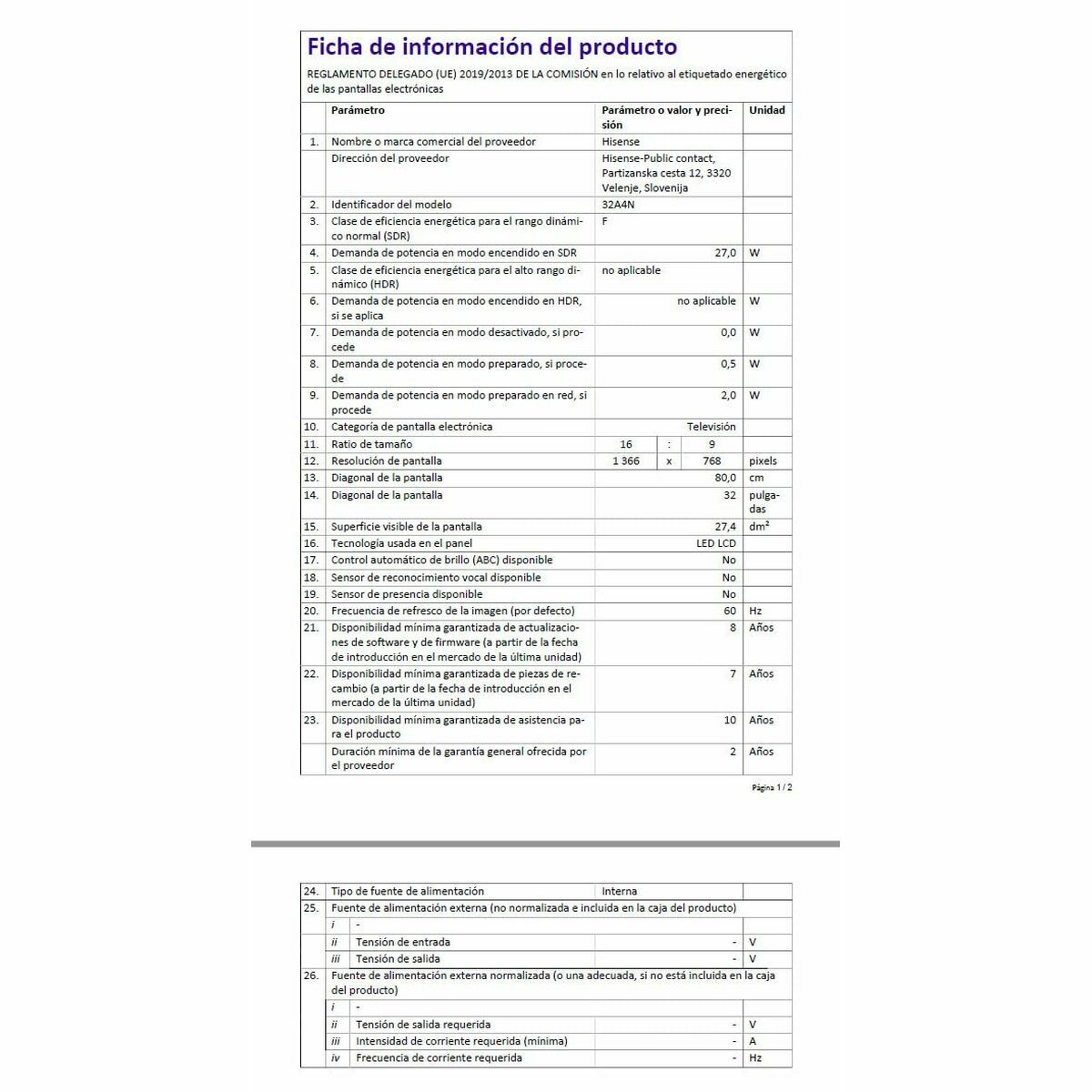 The Hisense 32A4N is a 32-inch Smart TV designed for users seeking a practical and functional solution for home entertainment. Its 32" screen offers a mixed resolution including Full HD and HD, ensuring good image quality for high-definition content and a suitable viewing experience for small spaces or secondary rooms. This model features a sober design in black with a plastic frame, helping to keep it lightweight and easy to install. It includes a DVB-C tuner, allowing reception of digital cable TV signals, expanding channel options without extra devices. Key features include noise reduction technology in the image and a sound equalizer that enhances audio by adjusting frequencies for a more balanced sound. As a Smart TV, it offers access to streaming apps and digital platforms through integrated connectivity, facilitating online content browsing and consumption. It also has HDMI ports to connect external devices like consoles, media players, or PCs, increasing versatility at home. Its energy rating is F, indicating moderately high consumption compared to more efficient models, a factor to consider for prolonged use and energy costs. The Hisense 32A4N is an affordable, practical choice for those wanting a compact smart TV that provides access to both traditional TV and online services with acceptable image quality and basic daily functions.