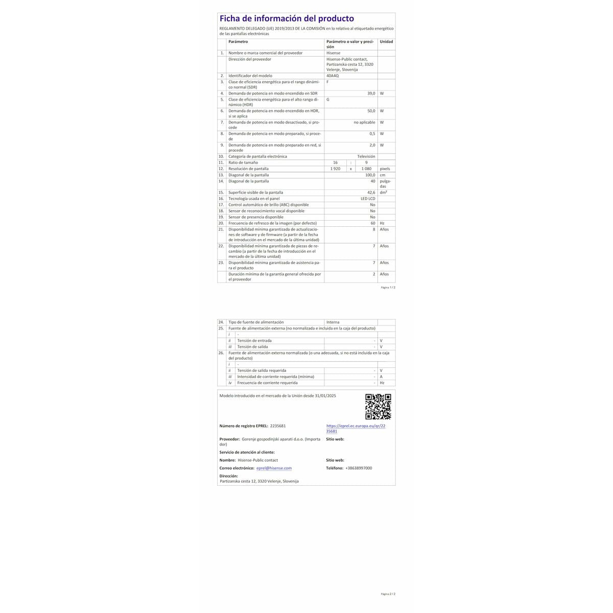The Hisense 40A4Q is a 40-inch Smart TV ideal for those seeking quality visuals in medium or smaller spaces, featuring a flat LED screen with Full HD resolution (1920 x 1080) for sharp images and vibrant colors in both movies and regular broadcasts. This model includes smart features via VIDAA, its proprietary operating system, offering smooth web browsing and easy access to popular streaming apps, keeping all your entertainment within reach in an intuitive way. It supports multiple tuner technologies (DVB-C, DVB-S2, DVB-T2), enabling reception of terrestrial, satellite, and cable digital signals, making the TV compatible with a wide range of broadcasters and TV services. Its sleek black design with a durable plastic finish fits easily into any décor, while features like sound equalizer, Dolby and DTS HD compatibility, and 14 W RMS audio output deliver an immersive and customizable audio experience. Built-in Wi-Fi connectivity allows you to fully enjoy Smart TV capabilities, while teletext and other classic options add versatility to the device. With an energy class F, this model prioritizes functionality with energy efficiency typical for its segment. The Hisense 40A4Q is a balanced solution for those looking for a smart TV that combines resolution, modern features, and connectivity tailored to current market standards.