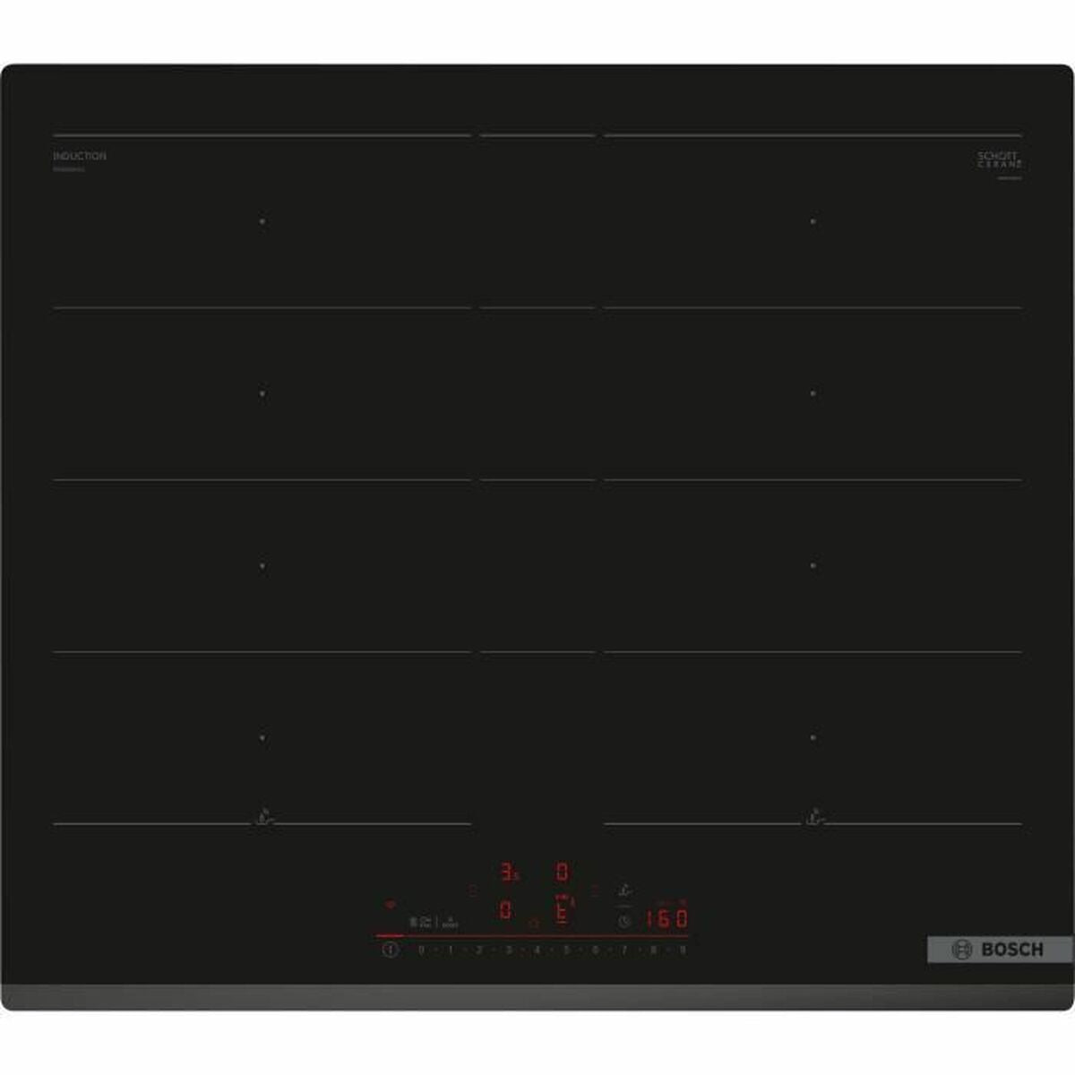 The BOSCH PXY63KHC1E induction hob is a high-efficiency built-in induction cooktop that combines functionality and modern design to fit contemporary kitchens. It features a sophisticated black color and compact dimensions of 60 cm wide by 52.2 cm deep, allowing easy installation in limited spaces without sacrificing an optimal cooking surface. This cooktop has four cooking zones, enabling simultaneous preparation of different dishes with precise and fast heat control typical of induction technology. Its features include a built-in timer to control cooking time for each zone, enhancing convenience and preventing errors during use. It also includes essential safety systems such as automatic shut-off and child lock, ensuring a safe environment by avoiding accidents or misuse. Its recessed design provides a clean, elegant kitchen look, while the induction system ensures even heat distribution, optimizing energy consumption and reducing cooking times. This PXY63KHC1E model belongs to the Bosch SER6 series with Home Connect, indicating compatibility with smart technologies for remote management and control, although this is not explicitly detailed in the provided information. Overall, the Bosch PXY63KHC1E cooktop is an efficient and safe solution for those seeking a functional kitchen appliance with refined design and advanced induction technology.
