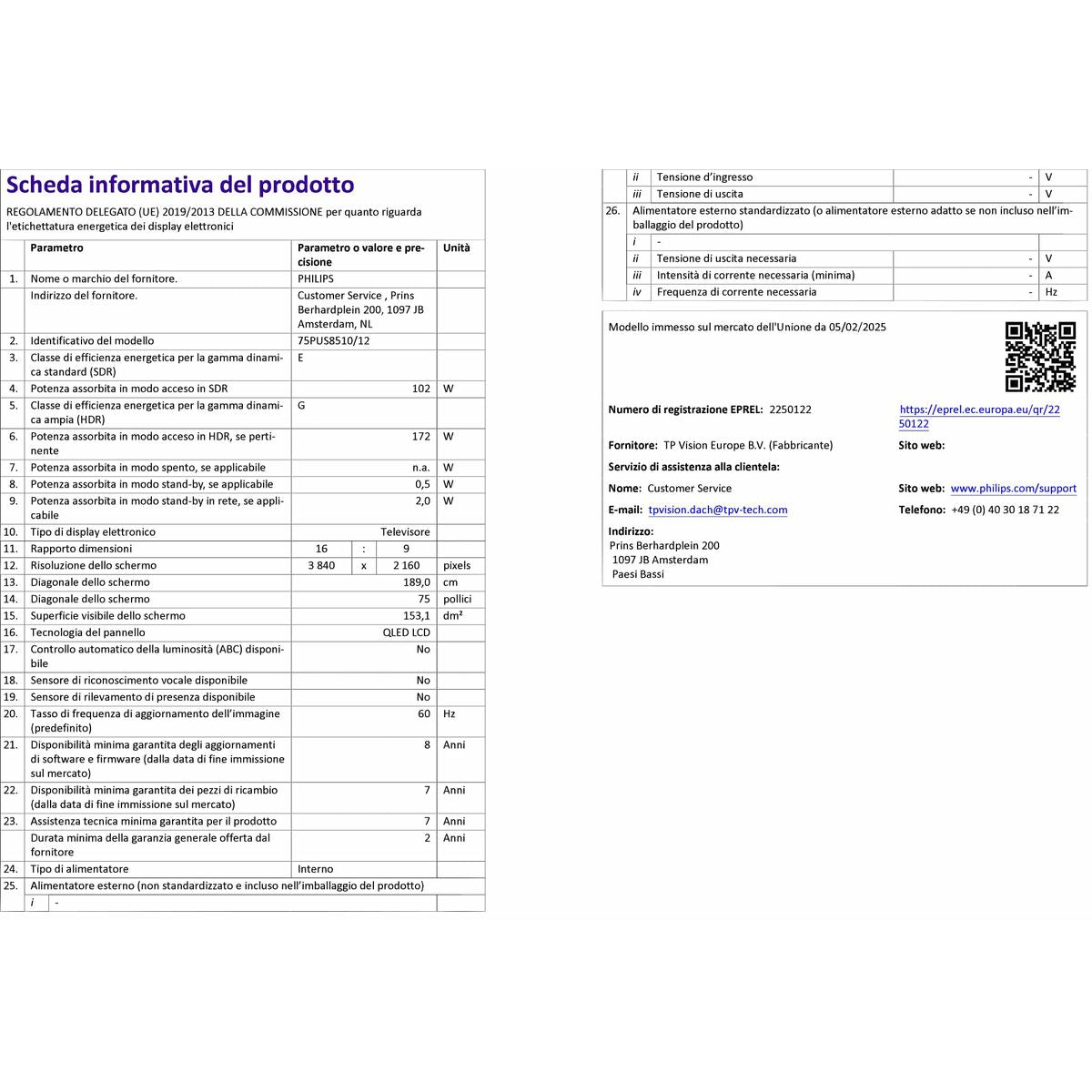 The Philips 75PUS8510/12 TV is a high-end Smart TV that combines advanced technology and elegant design in a large format, featuring a 75-inch screen that delivers an impressive visual experience for spacious living rooms and dedicated entertainment areas. Equipped with 4K Ultra HD resolution, it provides sharp, detailed images with vibrant colors and enhanced contrast to optimize content quality, whether watching movies, series, or playing video games. Its QLED technology ensures superior tone and brightness reproduction, while the Ambilight feature, a distinctive Philips characteristic, enhances immersion by projecting ambient lights around the TV edges synchronized with the image, creating an engaging and immersive environment. It includes typical Smart TV functionalities with WiFi connectivity for smooth and convenient access to streaming platforms, apps, and online content. Its energy rating E indicates responsible consumption for its category and size. For audio experience, this model features an equalizer allowing users to adjust sound output according to preferences, improving clarity and depth. The TV comes with an ergonomic remote control that facilitates navigation through its various functions and smart services. The black finish adds a sober, modern touch that fits different decor styles. Overall, the Philips 75PUS8510/12 is a solid choice for those seeking a large-format TV that combines advanced audiovisual capabilities, smart connectivity, and an immersive experience, suitable for versatile and demanding multimedia use.